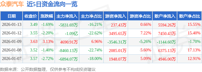 证券之星消息,截至2026年1月13日收盘,众泰汽车(000980)报收于3.49元,下跌1.69%,换手率2.05%,成交量102.92万手,成交额3.6亿元。