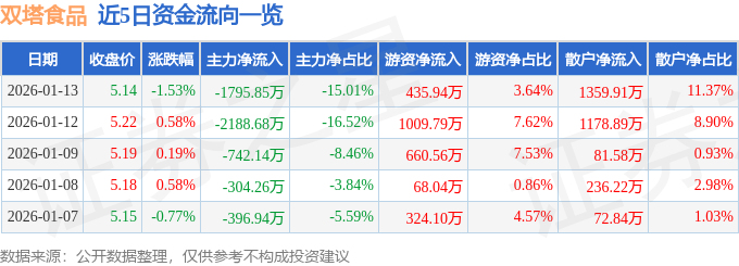 证券之星消息,截至2026年1月13日收盘,双塔食品(002481)报收于5.14元,下跌1.53%,换手率2.06%,成交量23.07万手,成交额1.2亿元。