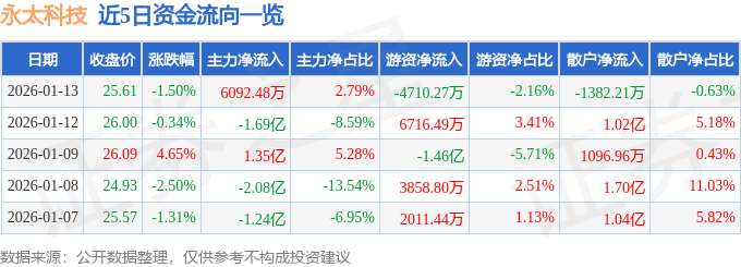 证券之星消息,截至2026年1月13日收盘,永太科技(002326)报收于25.61元,下跌1.5%,换手率10.44%,成交量84.34万手,成交额21.85亿元。