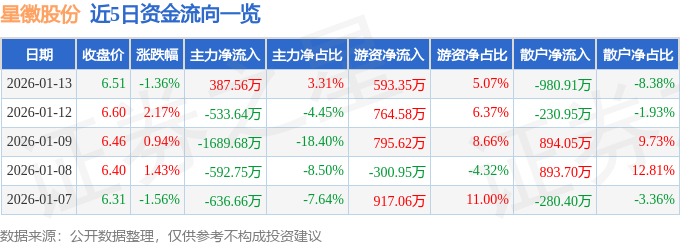 证券之星消息,截至2026年1月13日收盘,星徽股份(300464)报收于6.51元,下跌1.36%,换手率4.99%,成交量17.73万手,成交额1.17亿元。
