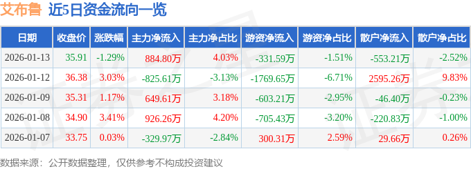 证券之星消息,截至2026年1月13日收盘,艾布鲁(301259)报收于35.91元,下跌1.29%,换手率6.08%,成交量6.01万手,成交额2.19亿元。