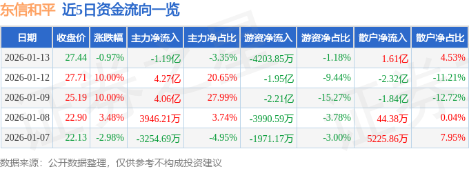 证券之星消息,截至2026年1月13日收盘,东信和平(002017)报收于27.44元,下跌0.97%,换手率21.46%,成交量124.46万手,成交额35.61亿元。