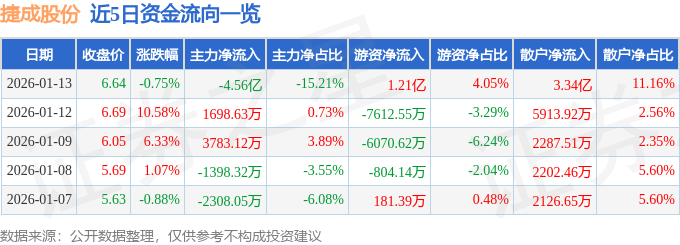 证券之星消息,截至2026年1月13日收盘,捷成股份(300182)报收于6.64元,下跌0.75%,换手率19.46%,成交量439.56万手,成交额29.96亿元。