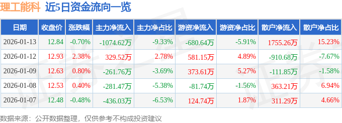 证券之星消息,截至2026年1月13日收盘,理工能科(002322)报收于12.84元,下跌0.7%,换手率2.54%,成交量8.94万手,成交额1.15亿元。
