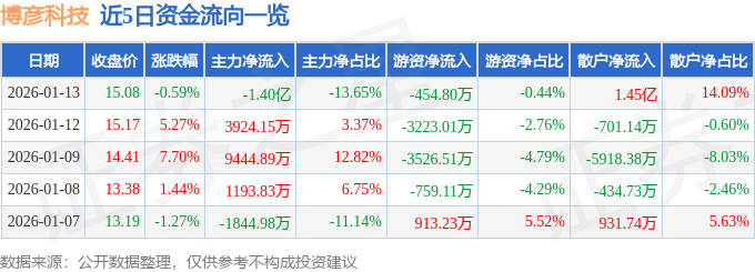 证券之星消息,截至2026年1月13日收盘,博彦科技(002649)报收于15.08元,下跌0.59%,换手率12.25%,成交量67.2万手,成交额10.28亿元。