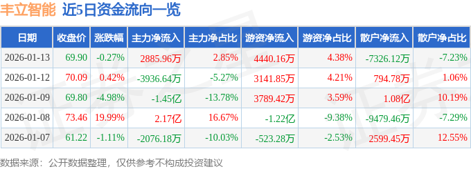 证券之星消息,截至2026年1月13日收盘,丰立智能(301368)报收于69.9元,下跌0.27%,换手率22.14%,成交量14.2万手,成交额10.13亿元。