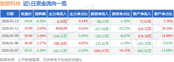 证券之星消息,截至2026年1月13日收盘,致欧科技(301376)报收于19.04元,下跌0.26%,换手率1.67%,成交量3.23万手,成交额6191.9万元。