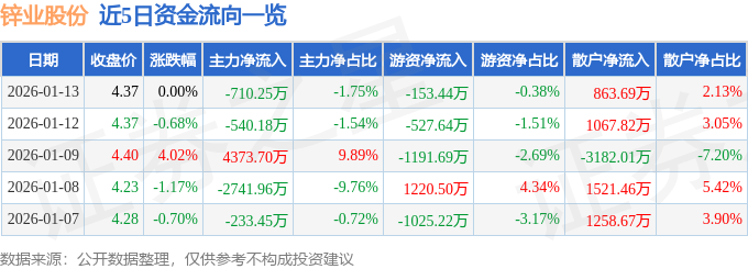 证券之星消息,截至2026年1月13日收盘,锌业股份(000751)报收于4.37元,上涨0.0%,换手率6.51%,成交量91.8万手,成交额4.05亿元。