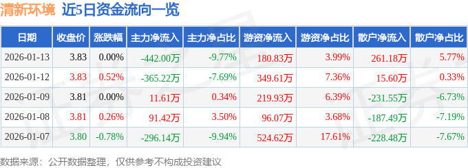 证券之星消息,截至2026年1月13日收盘,清新环境(002573)报收于3.83元,上涨0.0%,换手率0.84%,成交量11.82万手,成交额4526.3万元。