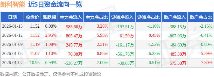 证券之星消息,截至2026年1月13日收盘,朗科智能(300543)报收于11.52元,上涨0.0%,换手率6.23%,成交量15.58万手,成交额1.79亿元。