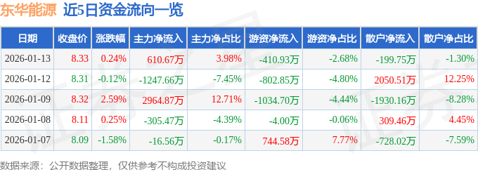 证券之星消息,截至2026年1月13日收盘,东华能源(002221)报收于8.33元,上涨0.24%,换手率1.26%,成交量18.4万手,成交额1.53亿元。