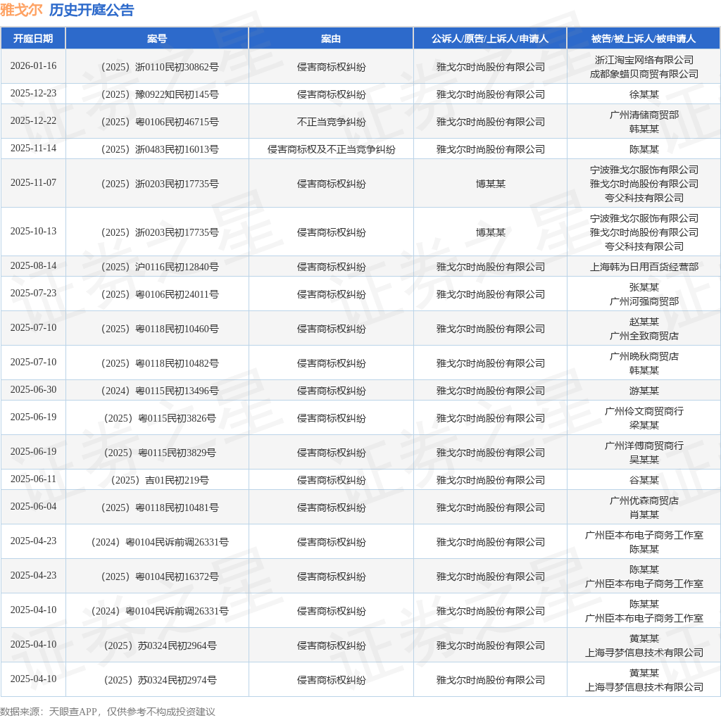 案号:(2025)浙0110民初30862号根据统计,近一年内以雅戈尔时尚股份有限公司为当事人的历史开庭公告有29则,其中案由为“侵害商标权纠纷”的公告以27则居首,其次为“不正当竞争纠纷”有1则,“侵害商标权及不正当竞争纠纷”有1则。历史开庭公告(前20条)如下: