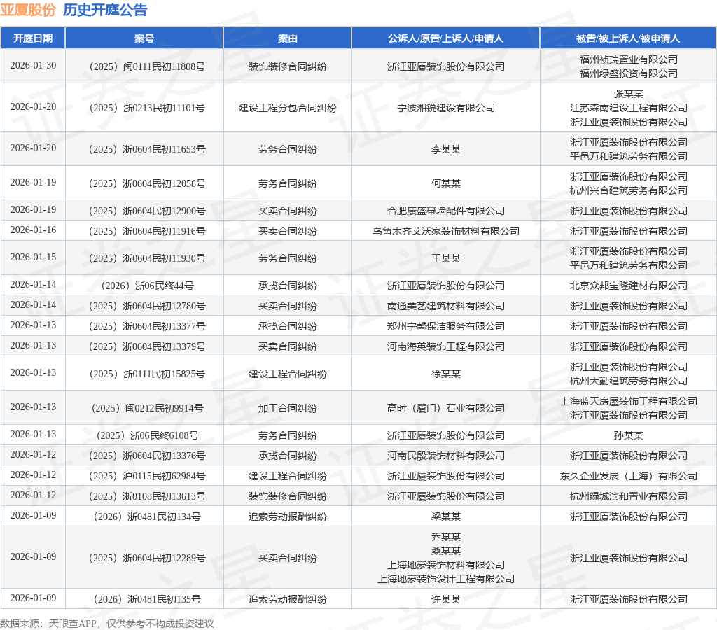 案号:(2025)浙0604民初11916号根据统计,近一年内以浙江亚厦装饰股份有限公司为当事人的历史开庭公告有627则,其中案由为“买卖合同纠纷”的公告以230则居首,其次为“劳务合同纠纷”有118则,“建设工程施工合同纠纷”有55则。历史开庭公告(前20条)如下: