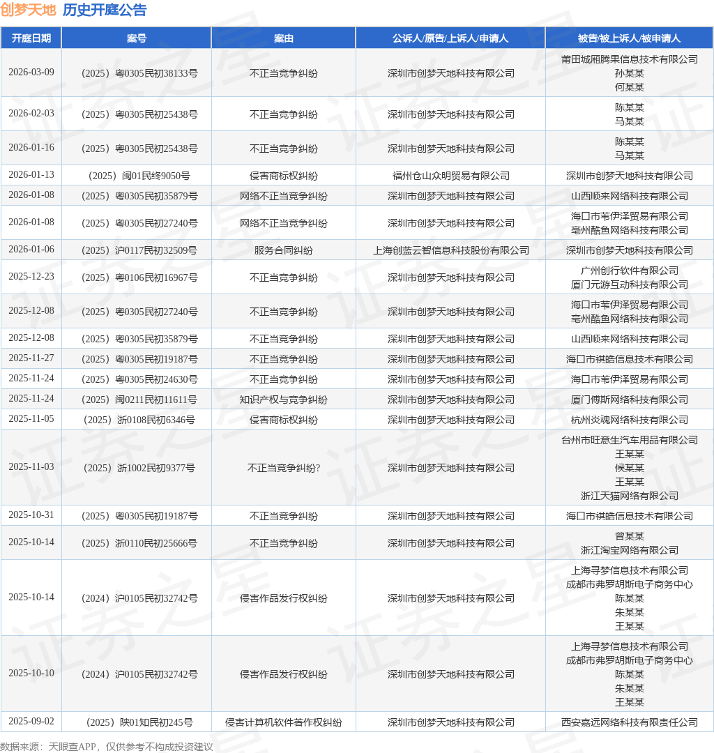 案号:(2025)粤0305民初25438号根据统计,近一年内以深圳市创梦天地科技有限公司为当事人的历史开庭公告有86则,其中案由为“不正当竞争纠纷”的公告以27则居首,其次为“网络不正当竞争纠纷”有24则,“侵害计算机软件著作权纠纷”有8则。历史开庭公告(前20条)如下: