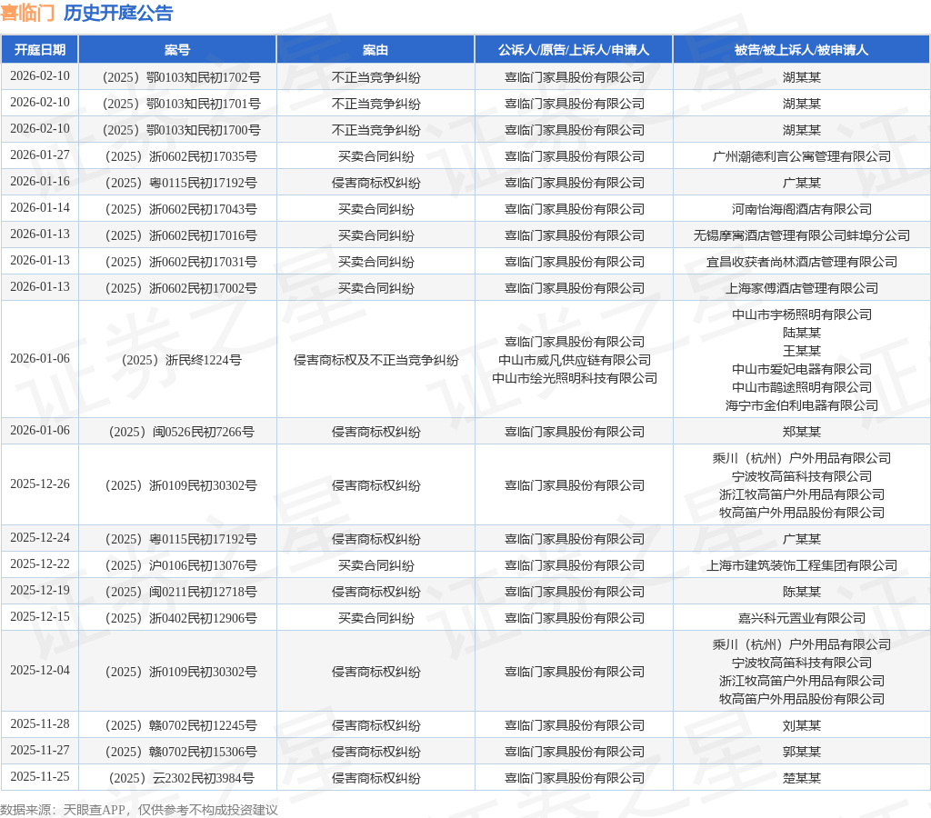 案号:(2025)粤0115民初17192号根据统计,近一年内以喜临门家具股份有限公司为当事人的历史开庭公告有62则,其中案由为“侵害商标权纠纷”的公告以24则居首,其次为“买卖合同纠纷”有16则,“侵害外观设计专利权纠纷”有5则。历史开庭公告(前20条)如下: