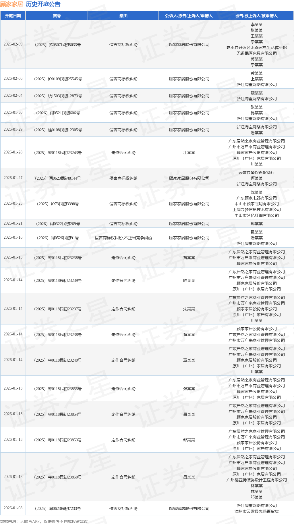 案号:(2026)闽0526民初91号根据统计,近一年内以顾家家居股份有限公司为当事人的历史开庭公告有219则,其中案由为“侵害商标权纠纷”的公告以175则居首,其次为“定作合同纠纷”有10则,“商标权权属、侵权纠纷”有7则。历史开庭公告(前20条)如下: