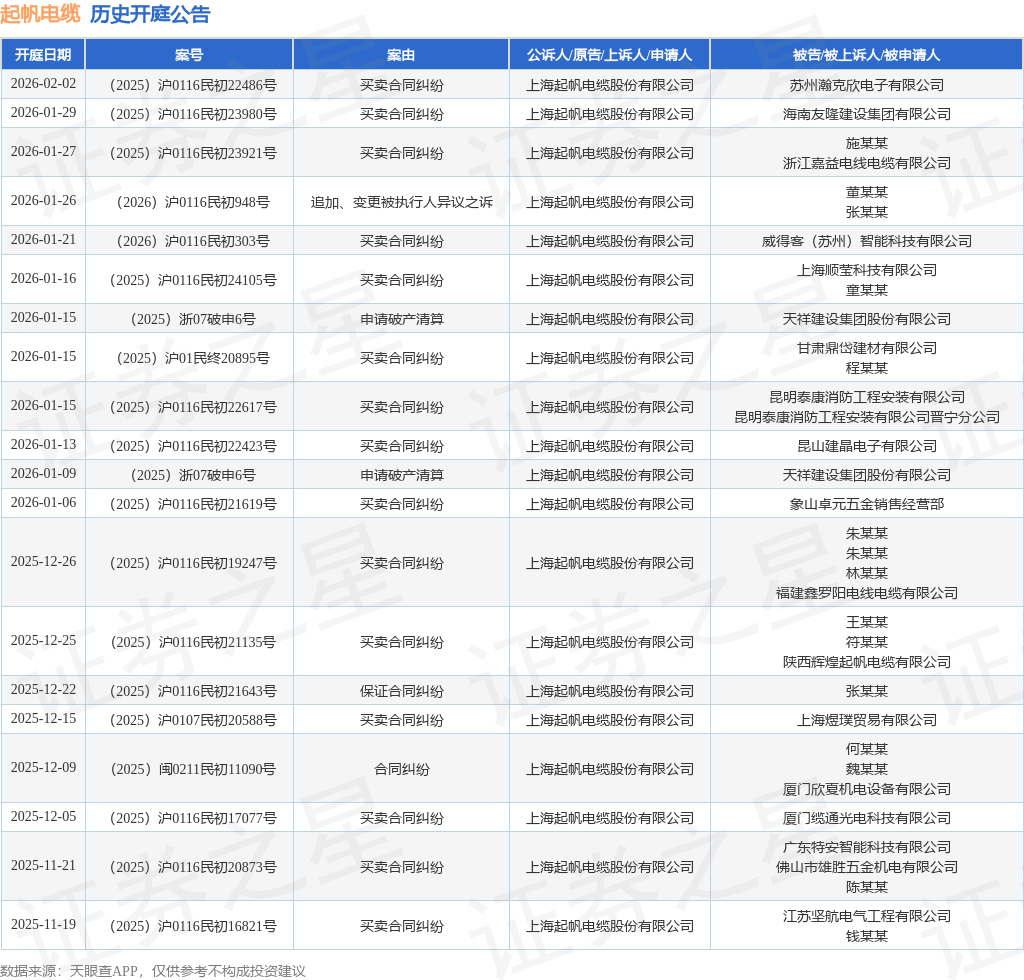 案号:(2025)沪0116民初24105号根据统计,近一年内以上海起帆电缆股份有限公司为当事人的历史开庭公告有118则,其中案由为“买卖合同纠纷”的公告以101则居首,其次为“合同纠纷”有5则,“产品责任纠纷”有2则。历史开庭公告(前20条)如下: