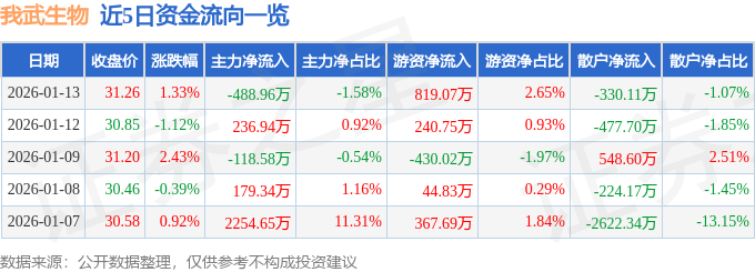 证券之星消息,截至2026年1月13日收盘,我武生物(300357)报收于31.26元,上涨1.33%,换手率2.03%,成交量9.81万手,成交额3.09亿元。