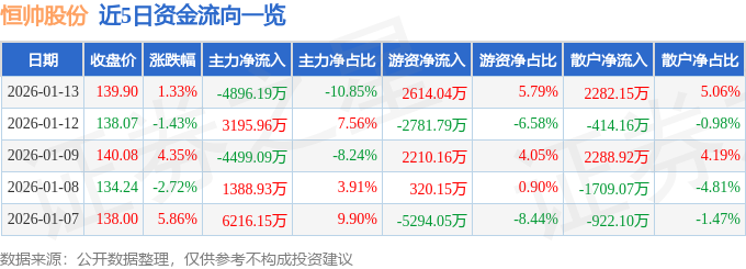 证券之星消息,截至2026年1月13日收盘,恒帅股份(300969)报收于139.9元,上涨1.33%,换手率6.34%,成交量3.18万手,成交额4.51亿元。