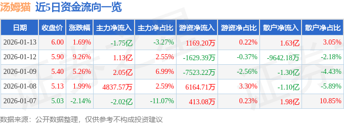 证券之星消息,截至2026年1月13日收盘,汤姆猫(300459)报收于6.0元,上涨1.69%,换手率26.97%,成交量886.46万手,成交额53.41亿元。