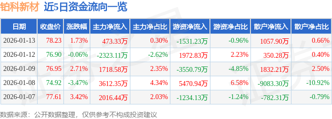 证券之星消息,截至2026年1月13日收盘,铂科新材(300811)报收于78.23元,上涨1.73%,换手率8.29%,成交量19.69万手,成交额15.95亿元。