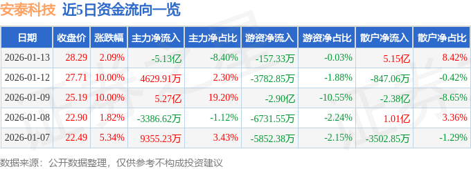 证券之星消息,截至2026年1月13日收盘,安泰科技(000969)报收于28.29元,上涨2.09%,换手率20.74%,成交量214.36万手,成交额61.08亿元。