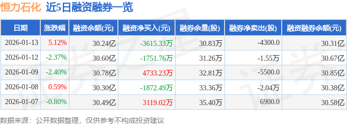证券之星消息,截至2026年1月13日收盘,恒力石化(600346)报收于23.83元,上涨5.12%,换手率0.58%,成交量40.71万手,成交额9.53亿元。