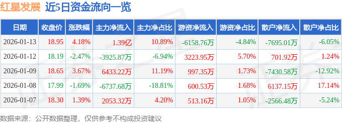 证券之星消息,截至2026年1月13日收盘,红星发展(600367)报收于18.95元,上涨4.18%,换手率20.29%,成交量65.32万手,成交额12.73亿元。