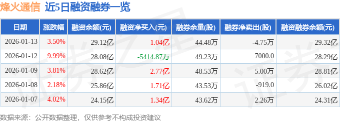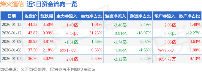 证券之星消息,截至2026年1月13日收盘,烽火通信(600498)报收于44.32元,上涨3.5%,换手率24.22%,成交量307.96万手,成交额139.16亿元。
