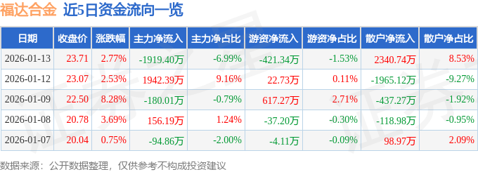 证券之星消息,截至2026年1月13日收盘,福达合金(603045)报收于23.71元,上涨2.77%,换手率8.44%,成交量11.44万手,成交额2.74亿元。