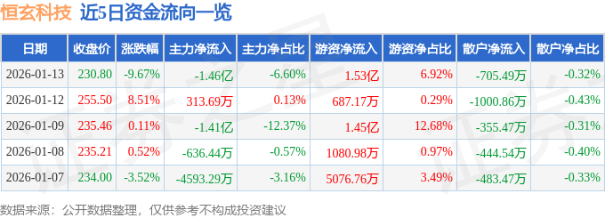 证券之星消息,截至2026年1月13日收盘,恒玄科技(688608)报收于230.8元,下跌9.67%,换手率5.51%,成交量9.29万手,成交额22.11亿元。