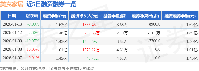 美克家居融资融券信息显示,融资方面,当日融资买入4829.82万元,融资偿还3494.37万元,融资净买入1335.45万元。融券方面,融券卖出8900.0股,融券偿还0.0股,融券余量3.68万股,融券余额12.51万元。融资融券余额1.62亿元。