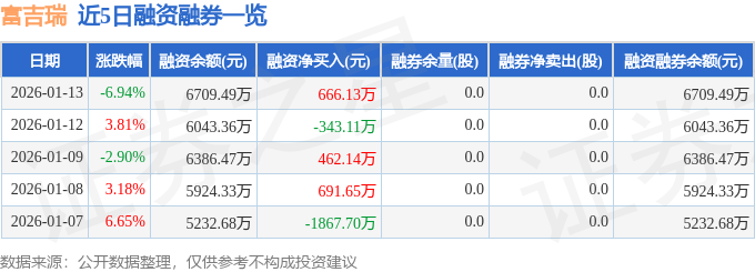 富吉瑞融资融券信息显示,融资方面,当日融资买入1971.82万元,融资偿还1305.69万元,融资净买入666.13万元。融券方面,融券卖出0.0股,融券偿还0.0股,融券余量0.0股,融券余额0.0万元。融资融券余额6709.49万元。
