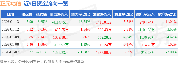 证券之星消息,截至2026年1月13日收盘,正元地信(688509)报收于5.9元,下跌6.65%,换手率10.6%,成交量40.8万手,成交额2.46亿元。