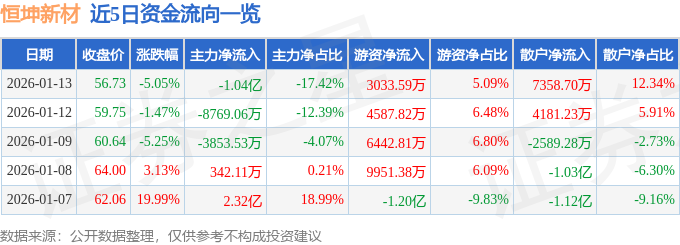 证券之星消息,截至2026年1月13日收盘,恒坤新材(688727)报收于56.73元,下跌5.05%,换手率20.56%,成交量10.33万手,成交额5.97亿元。