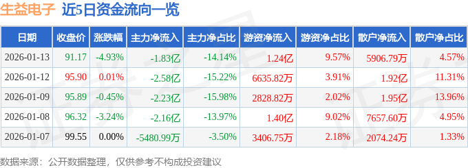 证券之星消息,截至2026年1月13日收盘,生益电子(688183)报收于91.17元,下跌4.93%,换手率1.66%,成交量13.8万手,成交额12.92亿元。
