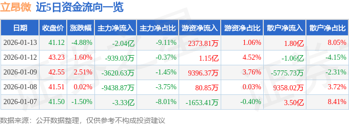 证券之星消息,截至2026年1月13日收盘,立昂微(605358)报收于41.12元,下跌4.88%,换手率7.9%,成交量53.03万手,成交额22.38亿元。