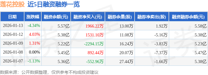 莲花控股融资融券信息显示,融资方面,当日融资买入8084.43万元,融资偿还6118.21万元,融资净买入1966.22万元。融券方面,融券卖出5.01万股,融券偿还3.09万股,融券余量13.0万股,融券余额80.21万元。融资融券余额5.58亿元。
