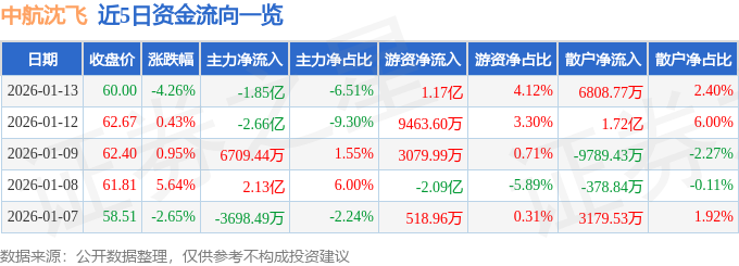 证券之星消息,截至2026年1月13日收盘,中航沈飞(600760)报收于60.0元,下跌4.26%,换手率1.67%,成交量47.09万手,成交额28.4亿元。