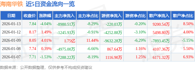 证券之星消息,截至2026年1月13日收盘,海南华铁(603300)报收于7.84元,下跌4.04%,换手率6.79%,成交量135.56万手,成交额10.83亿元。