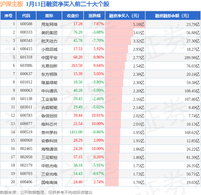 沪深主板融资净买入前三分别为:用友网络(600588)融资净买入5.18亿元、美的集团(000333)融资净买入3.61亿元、航天动力(600343)融资净买入3.32亿元,前20具体见下表: