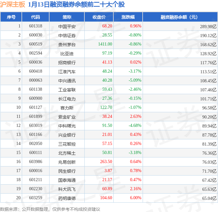 沪深主板融资融券余额前三分别为:中国平安(601318)融资融券余额289.98亿元、中信证券(600030)融资融券余额190.12亿元、贵州茅台(600519)融资融券余额168.62亿元,前20具体见下表: