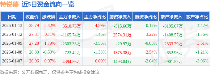 证券之星消息,截至2026年1月13日收盘,特锐德(300001)报收于28.79元,上涨5.42%,换手率6.4%,成交量65.98万手,成交额18.54亿元。