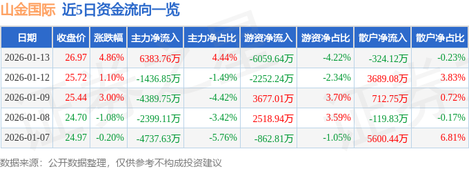 证券之星消息,截至2026年1月13日收盘,山金国际(000975)报收于26.97元,上涨4.86%,换手率2.09%,成交量52.8万手,成交额14.36亿元。