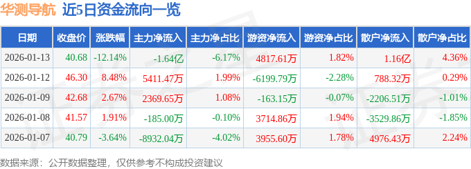 证券之星消息,截至2026年1月13日收盘,华测导航(300627)报收于40.68元,下跌12.14%,换手率9.83%,成交量63.64万手,成交额26.54亿元。