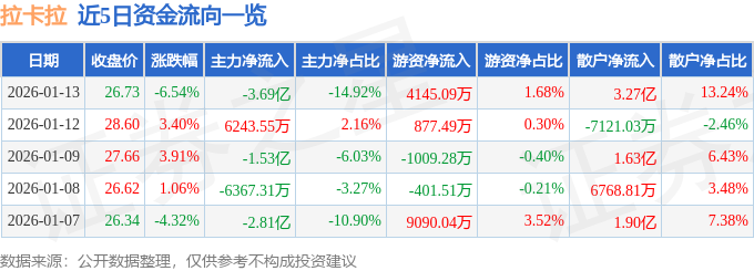 证券之星消息,截至2026年1月13日收盘,拉卡拉(300773)报收于26.73元,下跌6.54%,换手率12.3%,成交量90.35万手,成交额24.71亿元。