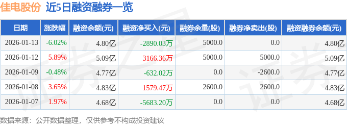 佳电股份融资融券信息显示,融资方面,当日融资买入5810.18万元,融资偿还8700.21万元,融资净偿还2890.03万元。融券方面,融券卖出0.0股,融券偿还0.0股,融券余量5000.0股,融券余额7.18万元。融资融券余额4.8亿元。