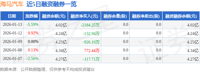 海马汽车融资融券信息显示,融资方面,当日融资买入5508.9万元,融资偿还7693.14万元,融资净偿还2184.25万元。融券方面,融券卖出0.0股,融券偿还0.0股,融券余量0.0股,融券余额0.0万元。融资融券余额4.02亿元。
