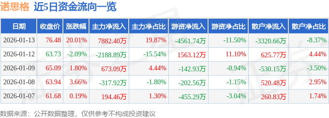 证券之星消息,截至2026年1月13日收盘,诺思格(301333)报收于76.48元,上涨20.01%,涨停,换手率9.65%,成交量5.52万手,成交额3.97亿元。
