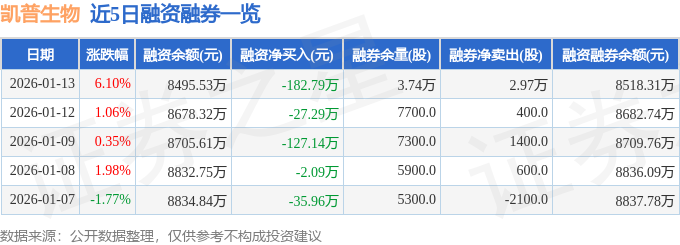 凯普生物融资融券信息显示,融资方面,当日融资买入1960.97万元,融资偿还2143.75万元,融资净偿还182.79万元。融券方面,融券卖出3.15万股,融券偿还1800.0股,融券余量3.74万股,融券余额22.78万元。融资融券余额8518.31万元。